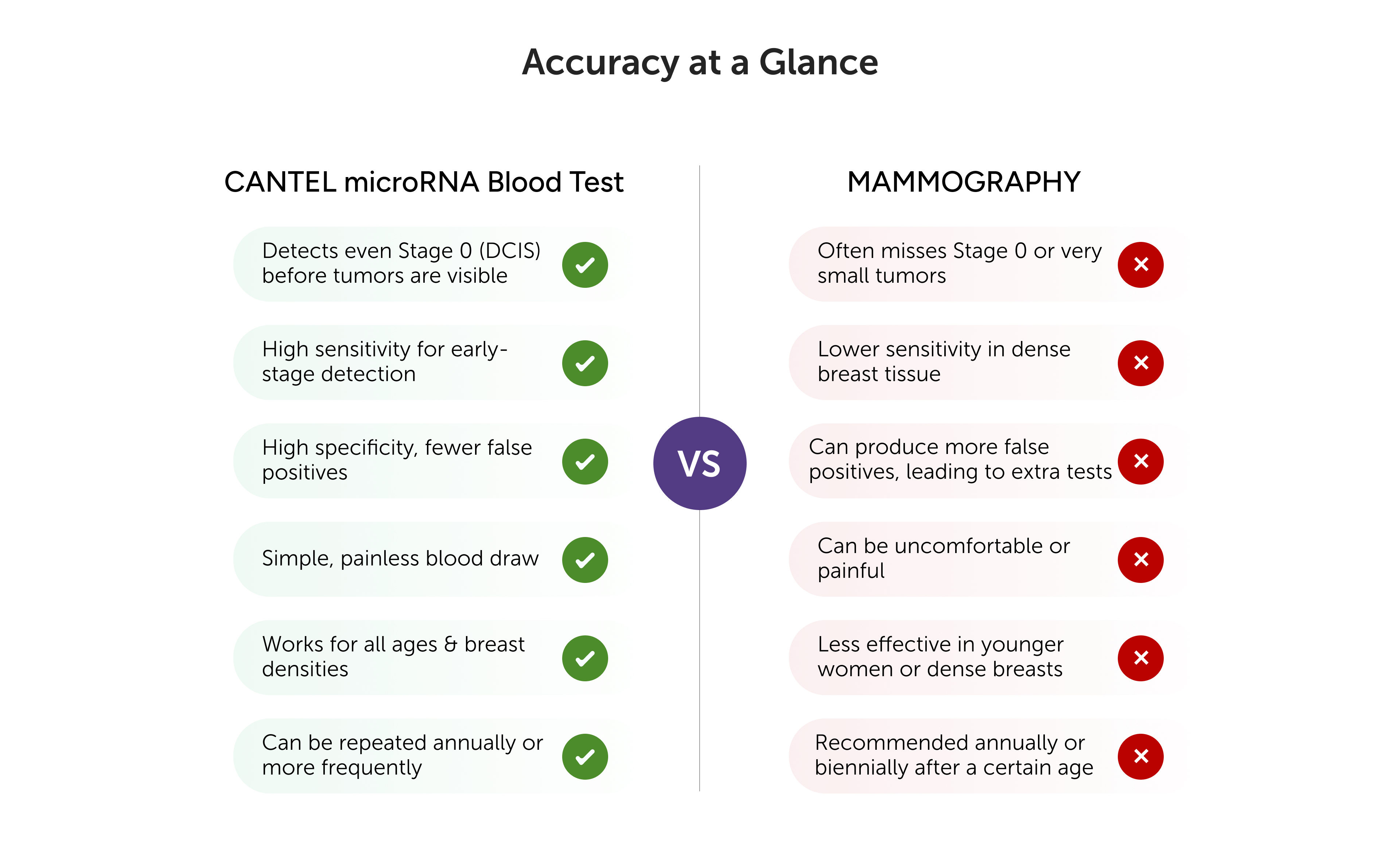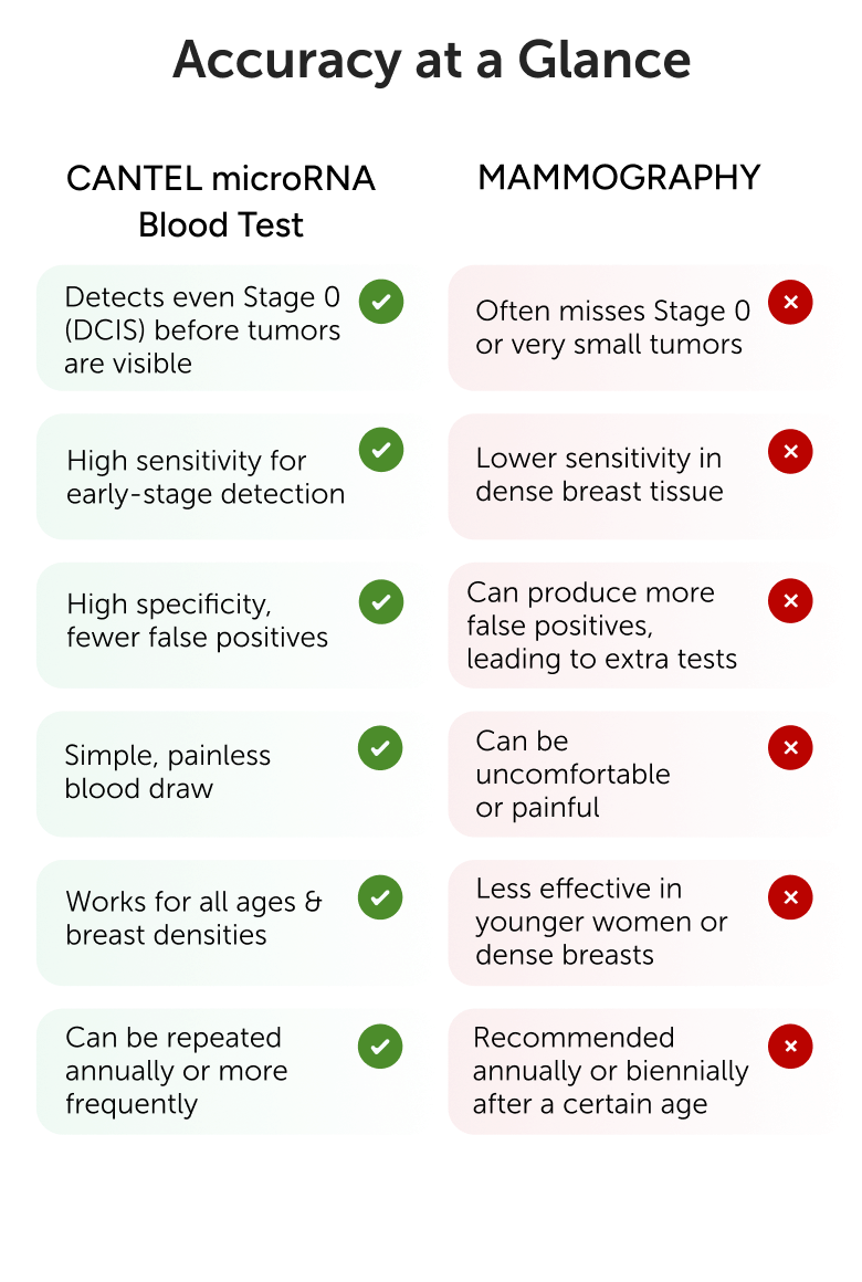 Patients with a positive result may have breast cancer should be followed by mammography. The cantel blood test can be considered in a manner similar to guideline-recommended non-invasive BC screening modalities and is not a replacement for diagnostic mammography or for surveillance mammography for high-risk individuals.