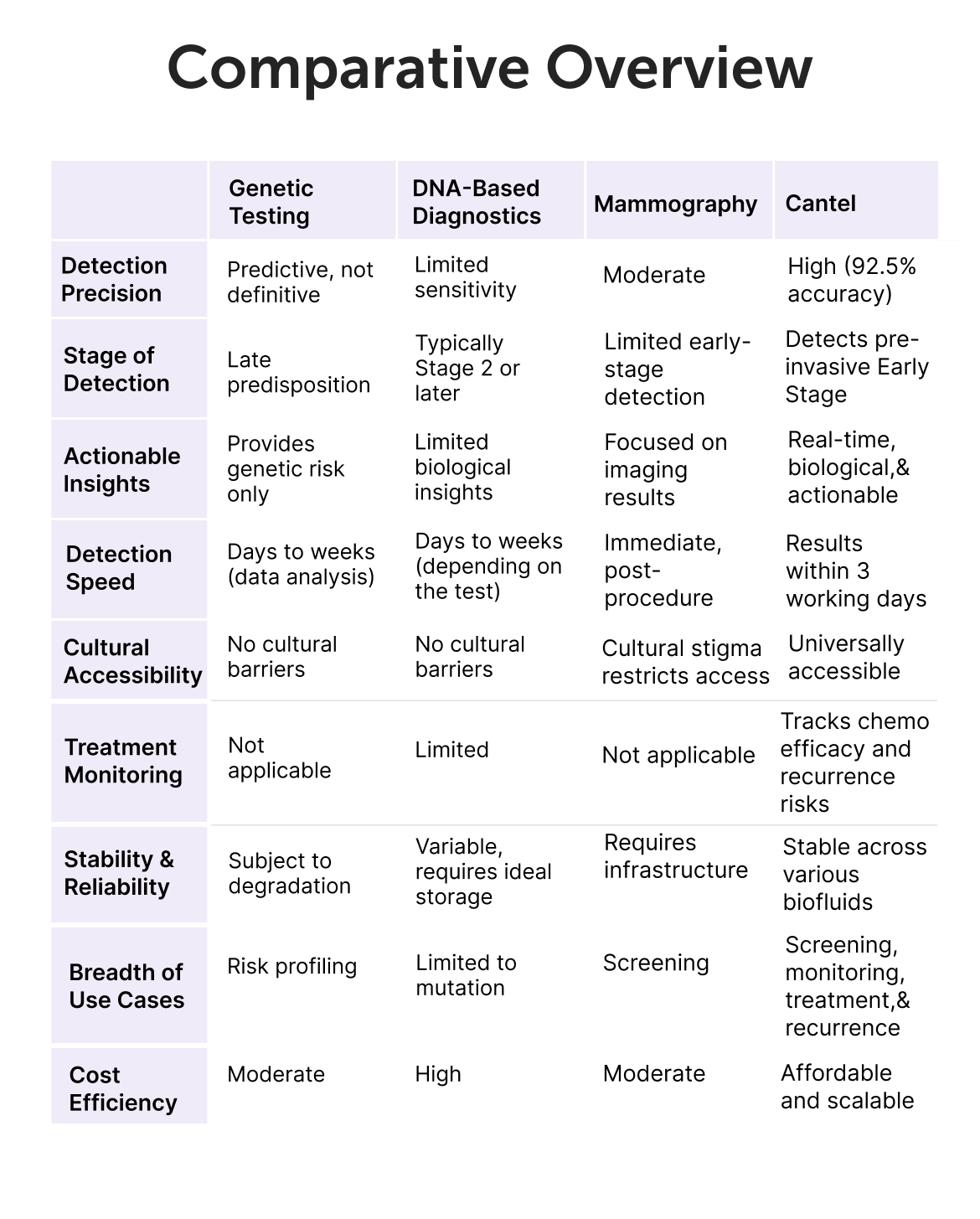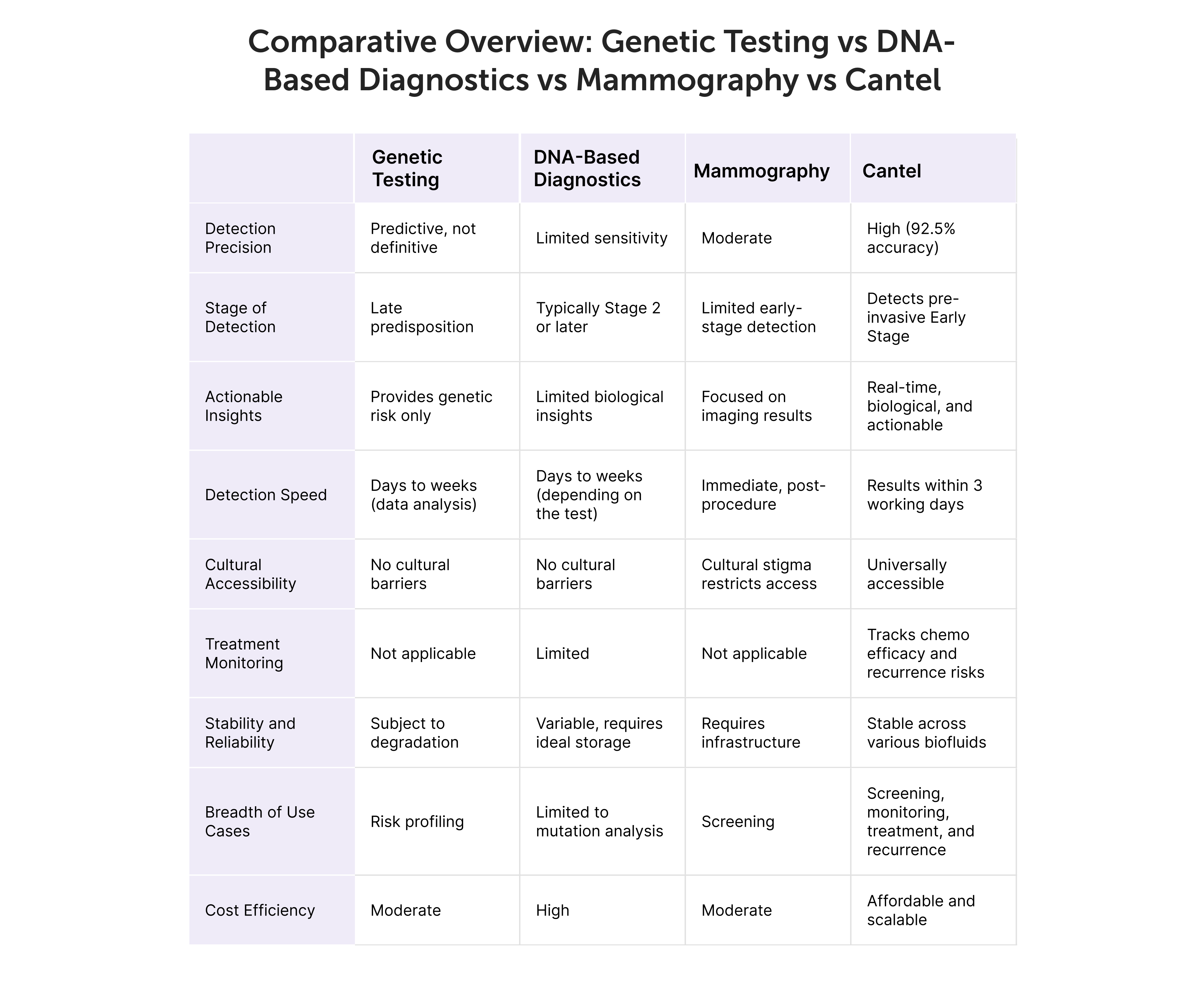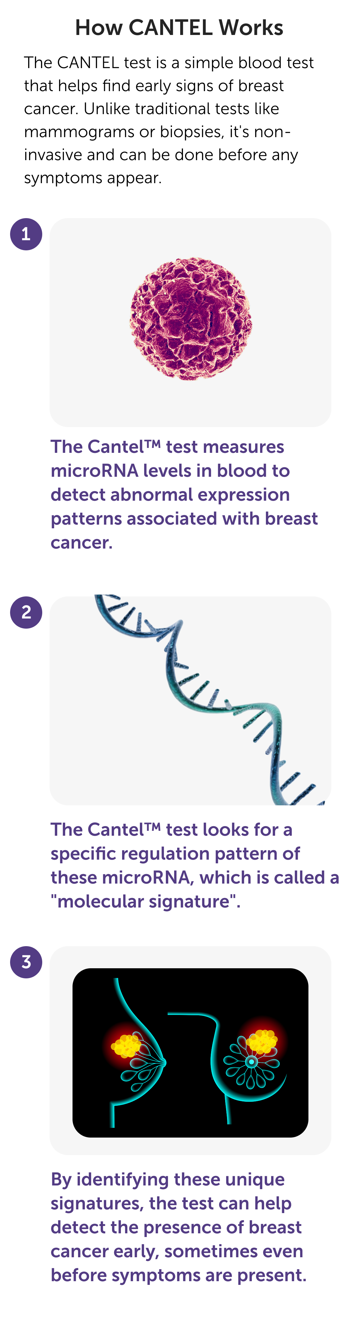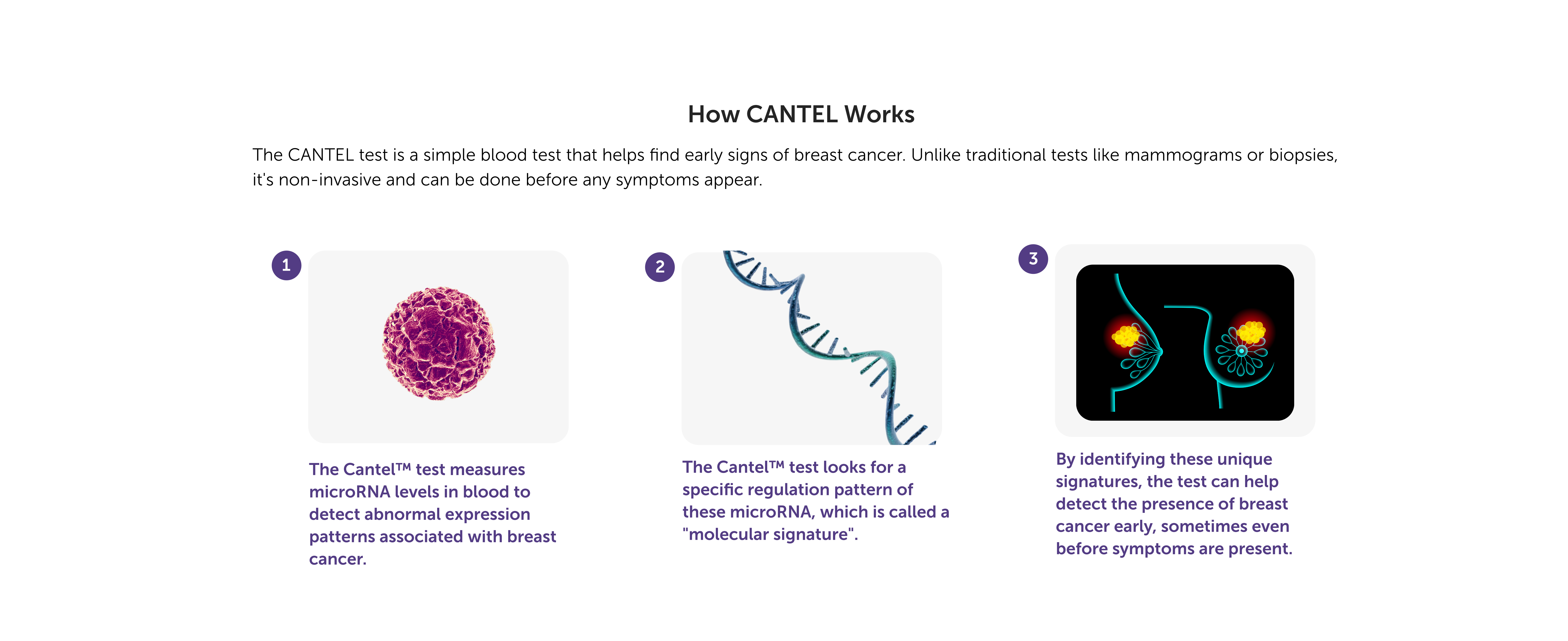 The results of this test are not a guarantee of the presence or absence of breast cancer and should not be used as the sole basis for diagnosis or to replace standard medical care. False positive and false negative results may occur due to biological variations and other factors. Results should be interpreted by a qualified healthcare professional as part of a complete clinical assessment. Cantel™ test may be repeated annually. Individual is advised to consult a physician if further guidance is required.